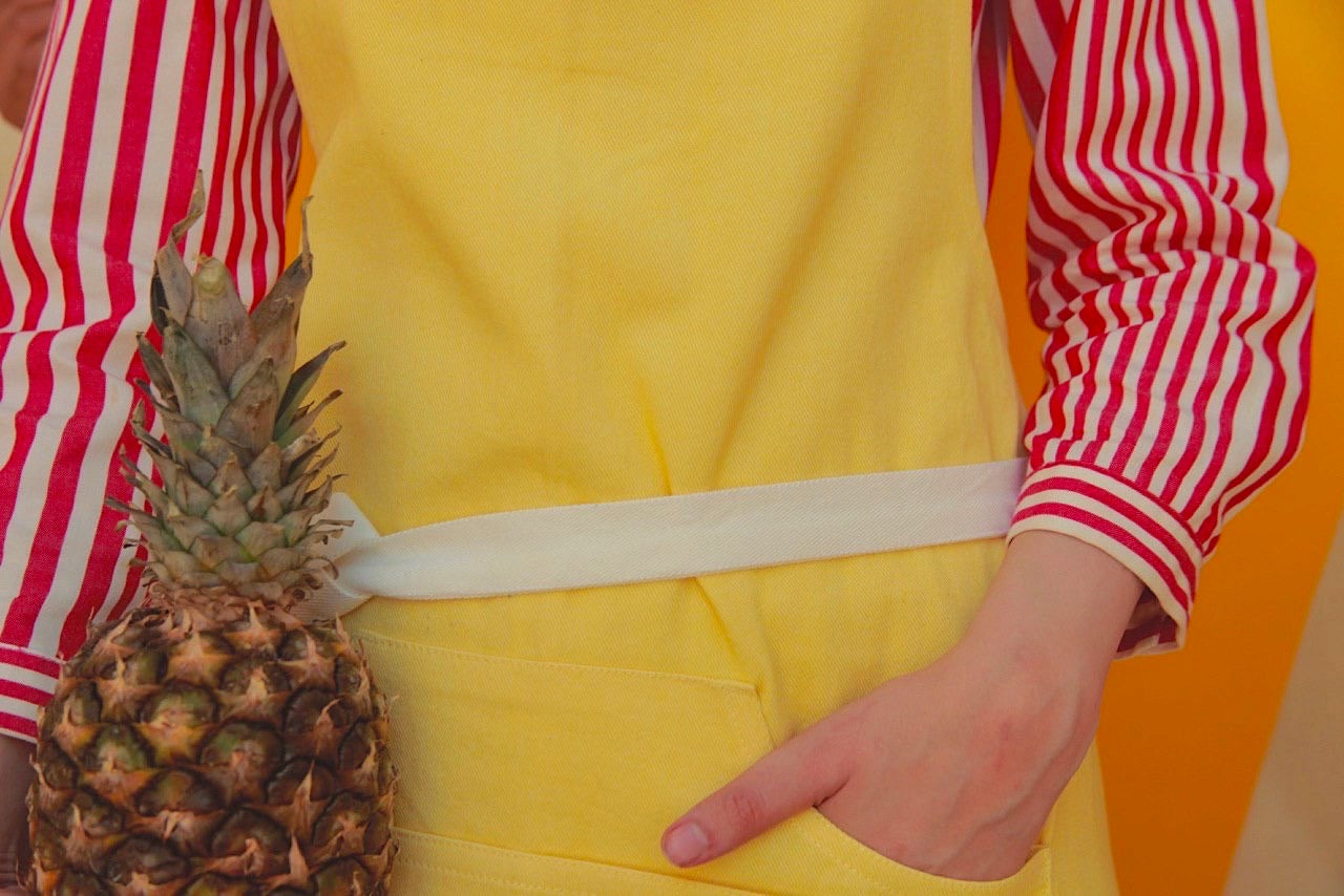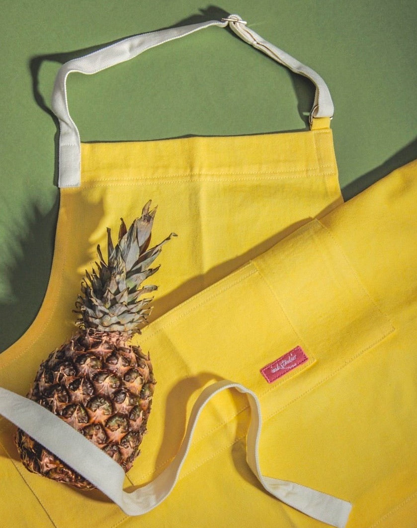 Nothing says summer like the fun shade of yellow which is why this apron is must-have ! Just like HONEY DEW its soft, sweet & happy. This bib style apron made with 100% cotton denim, dyed to a bright yellow features a handy hoodie pocket for all your essentials and fabric vanilla straps.