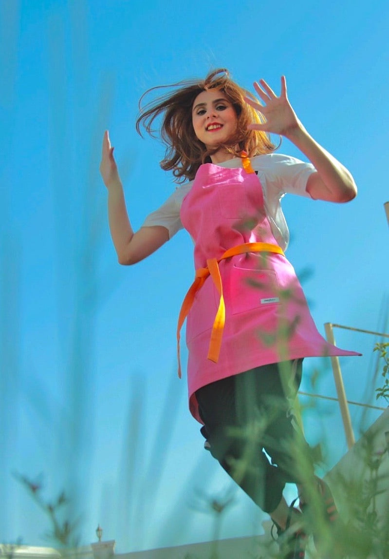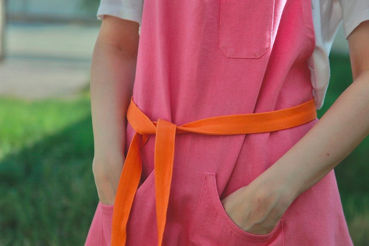 You asked for it and we gave you one ! A perfect pink apron with touches of tangerine just like your perfect summer drink. This pink a colada apron is made from 100% cotton denim dyed pink to perfection. The easy bib style gives you enough room for adjusting and pockets just adds to it.