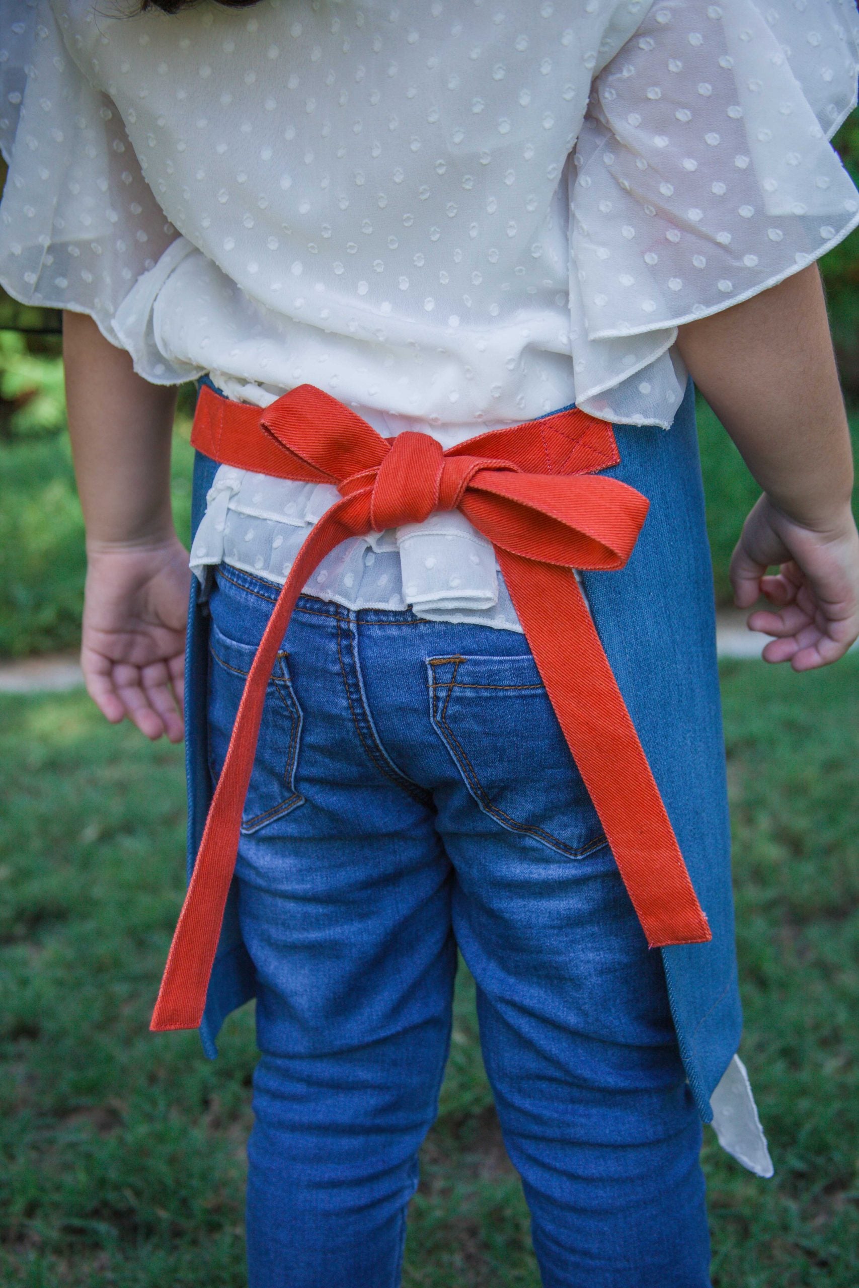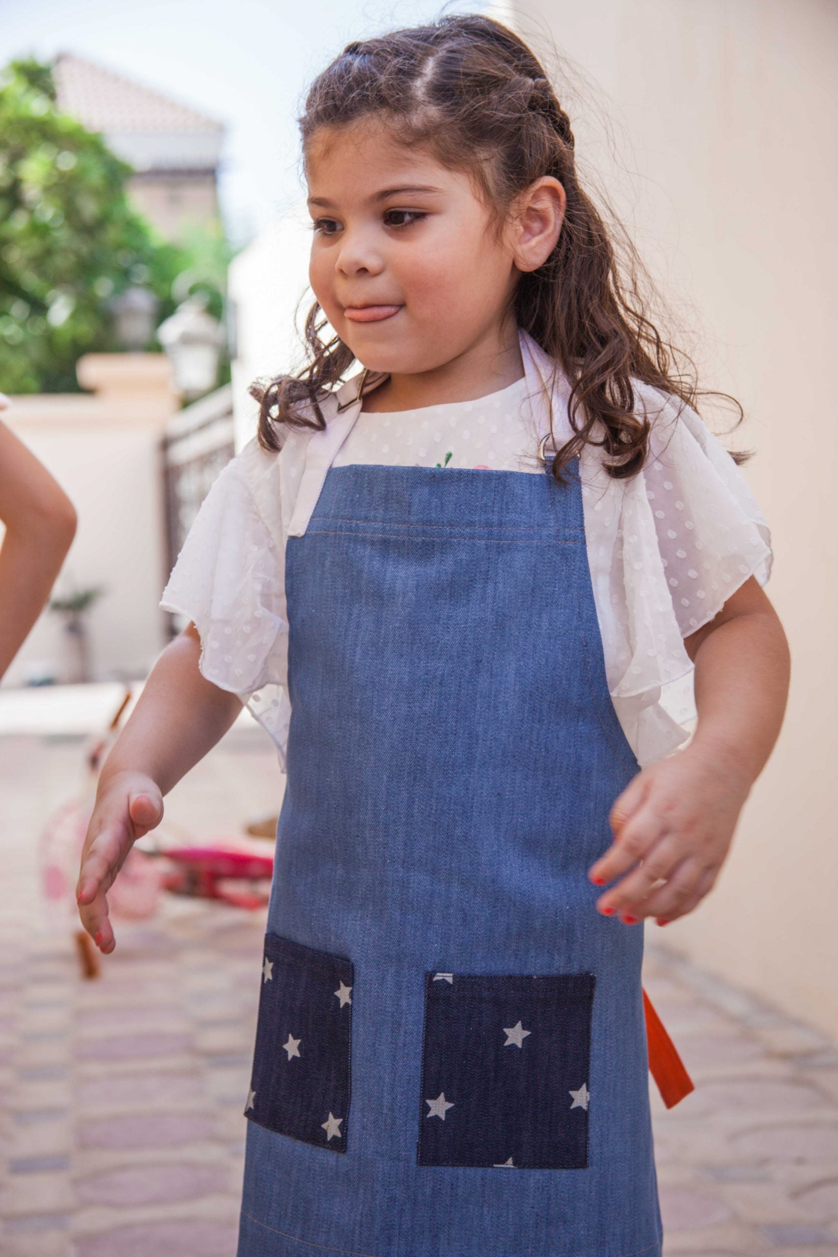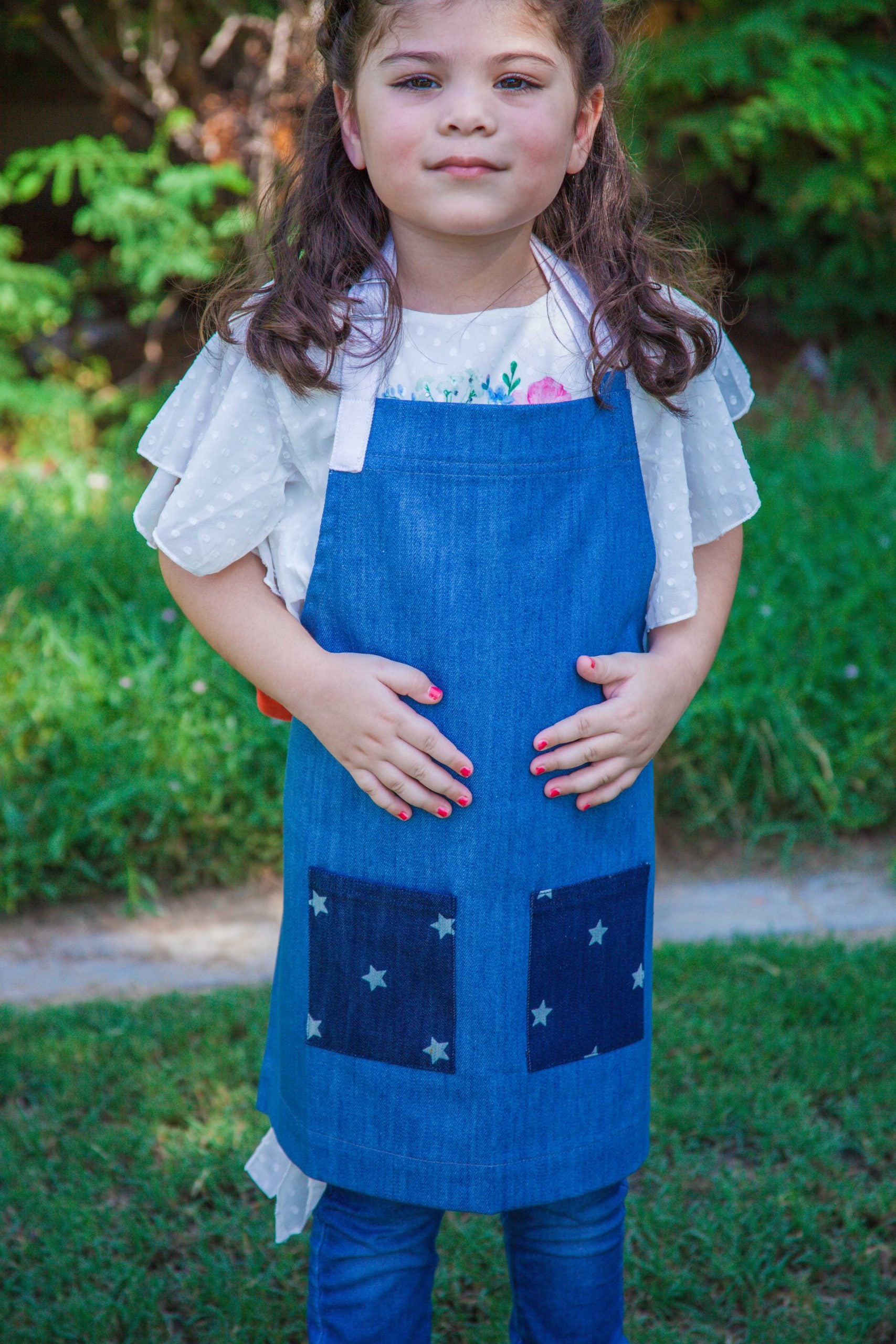 This one is our personal fav. Why ? cause it features our classic blue denim and star print denim making it an all rounder for those gardening adventures with dad or painting experiments with mom. It features red fabric straps adding a pop of color.